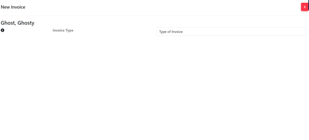 Select + Invoice from drop-down options. This will bring up a pop-up window titled New Invoice. The pop-up will look like this: