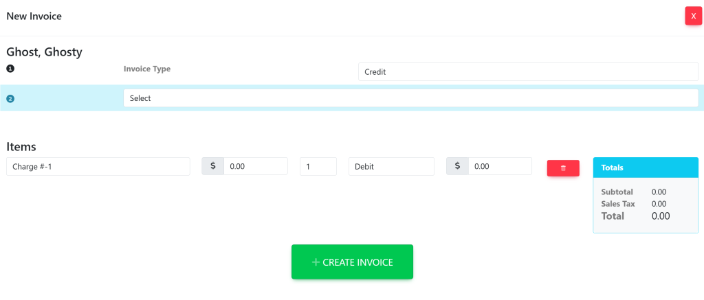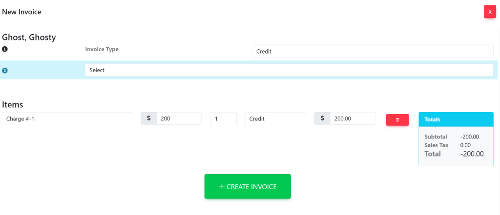 In the box to the left of the total, make sure to select Credit. Your total will appear to be negative. Select the green button titled ‘+ Create Invoice’.