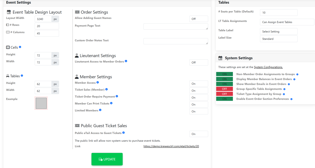 Use the On/Off toggle to select On. A green box titled Update will appear at the bottom of the Event Settings box. It will look like this: