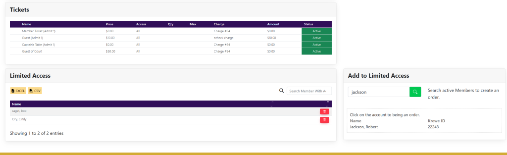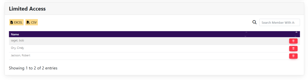 Within the Add To Limited Access box, locate the Search Members search bar. Type in the name of the member and select the green magnifying glass to the right. A list of the members’ names will appear that looks like this: