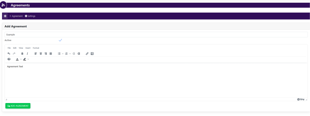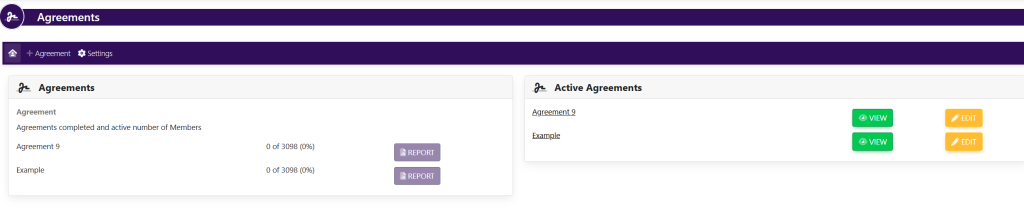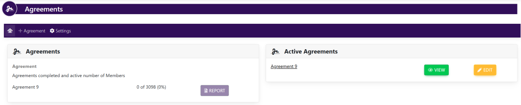 Select the green button titled Add Agreement at the bottom of the page to save. The new agreement will now show in the list of the current agreements. See here: