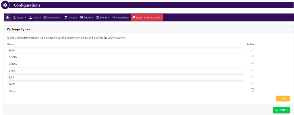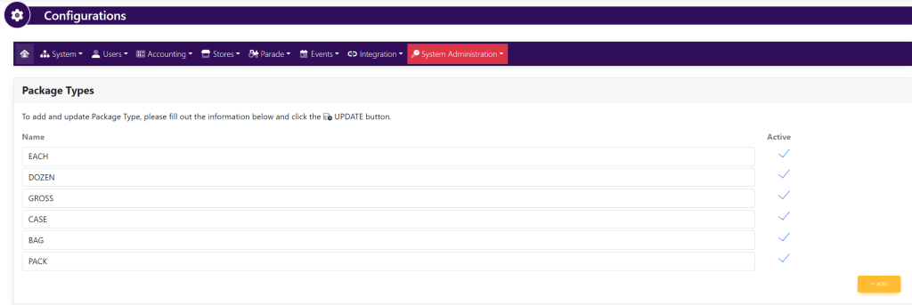 Click the yellow + Add button in the bottom right-hand corner. A blank box will appear below the established package types shown here:
