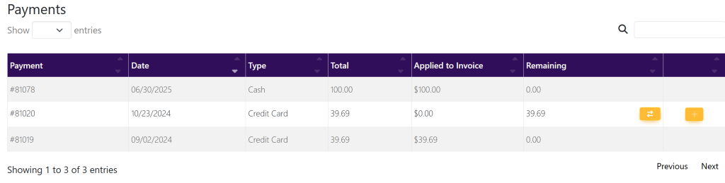 In the payments box, you will see that there are 2 yellow arrows to the right of the payment that has not been applied. They will look like this: