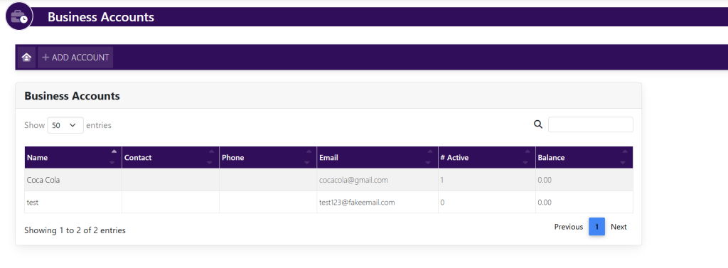 On the list of Business Accounts, click on the row of the Business Account to add a User. It will look like this: