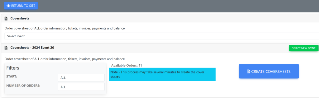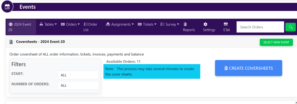 Select your filters in the Coversheets [Name of Event] box: