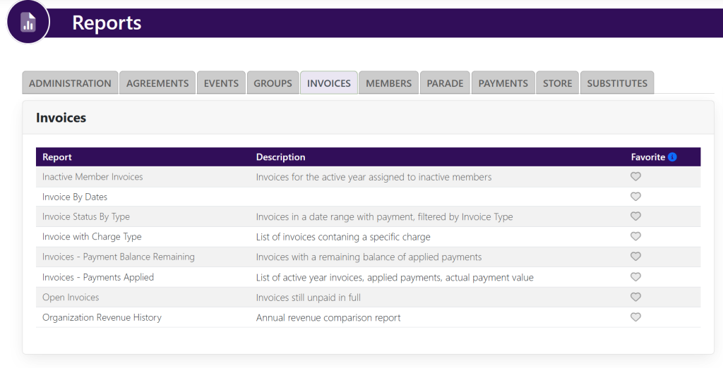 You can access this report by selecting the Reports button at the top right hand of your screen near the Settings and Configurations. A page will appear that looks like this: