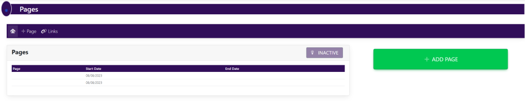 To add a page, click the green button to the right of the screen titled Add Page. Alternatively, you can select +Page within the horizontal navigation bar.