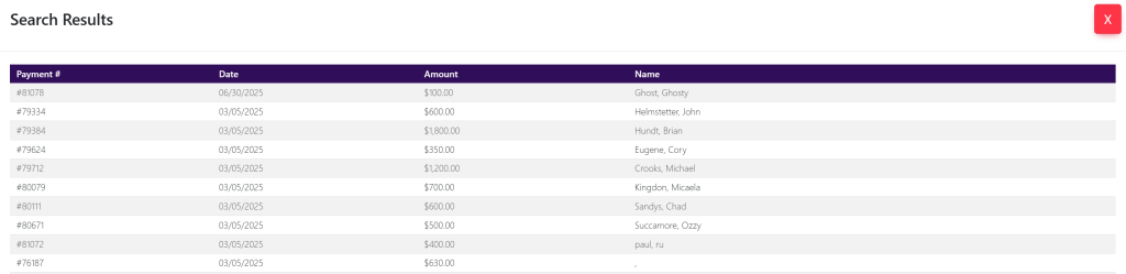 In the Search Payments search bar at the top right of your screen, you can type in the invoice number and select the magnifying glass.