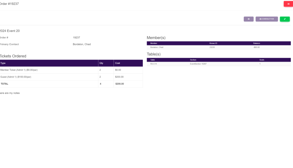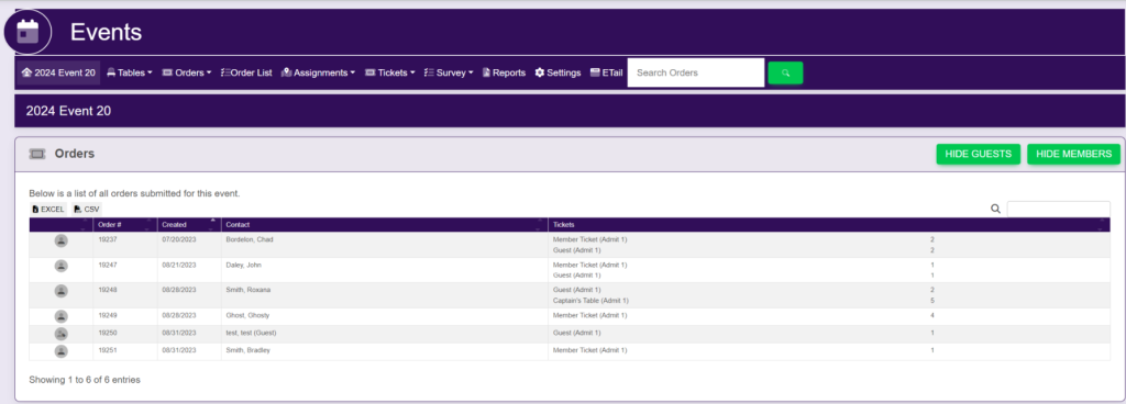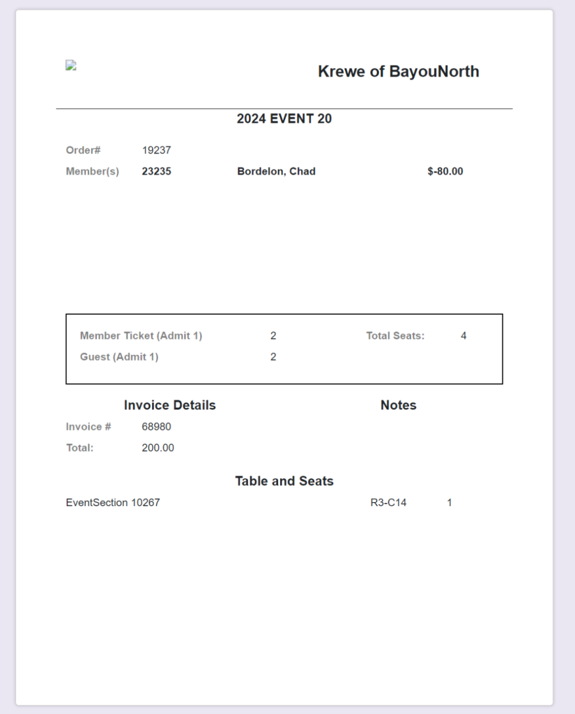 This will list the Order #, Member Name, # of Member Tickets, # of Guest Tickets, Invoice #, the total of the invoice and the Table and Seats in which they are assigned.