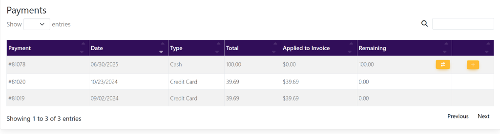 Within the Payments box, you will see payments that have been made to the account. To the right of the payment that you wish to transfer, you will see a yellow button with 2 arrows. that looks like this: