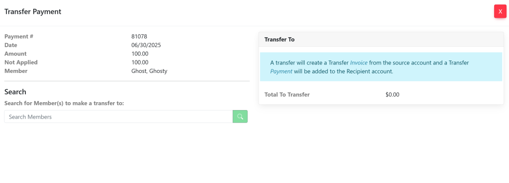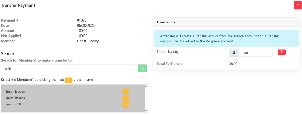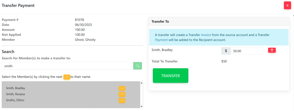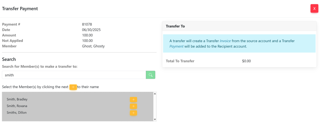 Within the search box, type in the members’ name that you would like to transfer the payment to. A list will appear that looks like this: