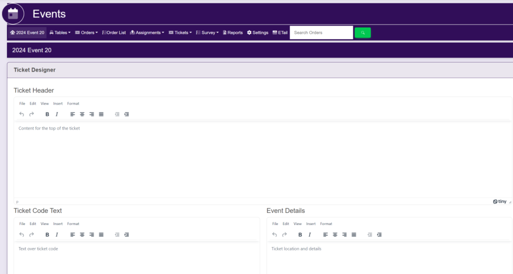In the horizontal bar at the top of the page, select Ticket. A drop down will appear. Select Ticket Design. This will take you here: