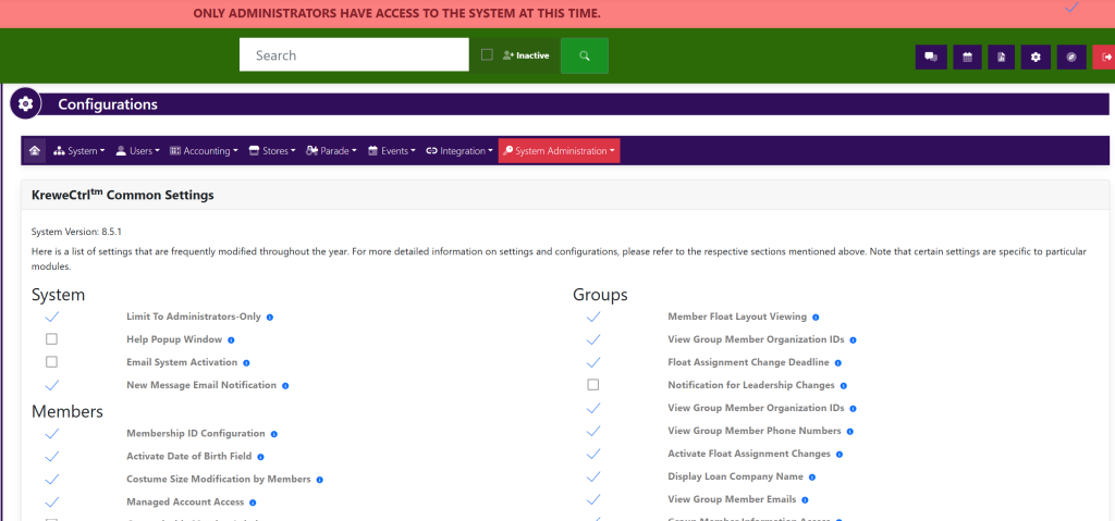 A red banner will appear at the top of the screen that says Only Administrators Have Access To The System At This Time.
