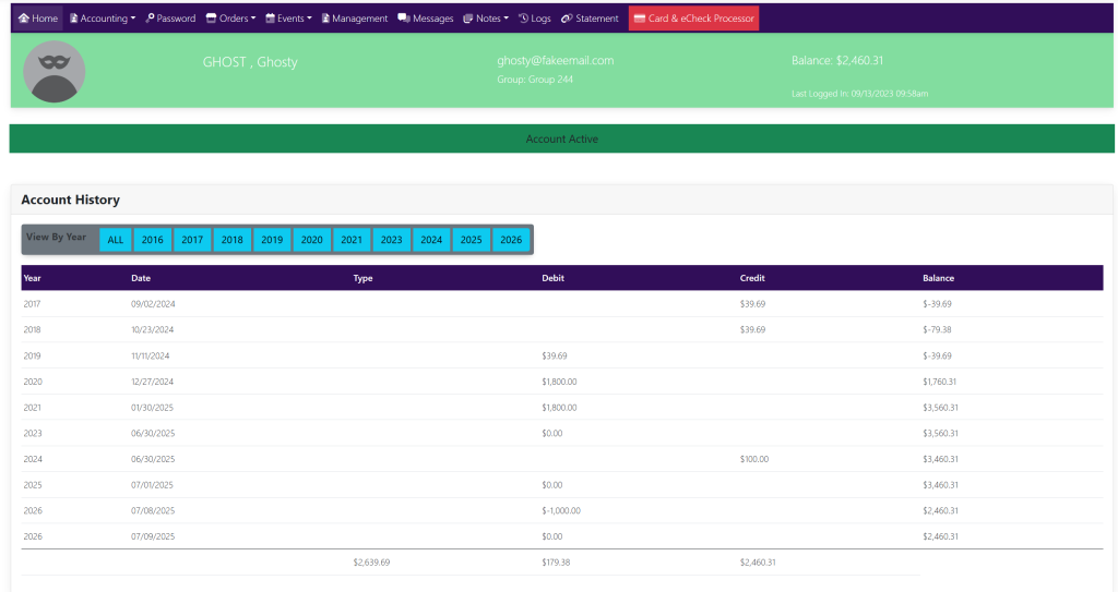 In the horizontal navigation bar, select Accounting. A drop down will appear. Select History. This will take you here:
