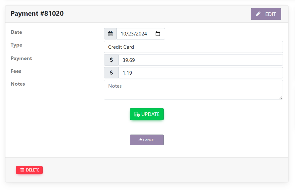 To edit the payment, select the purple button titled Edit in the Payment # box. A box will appear that looks like this: